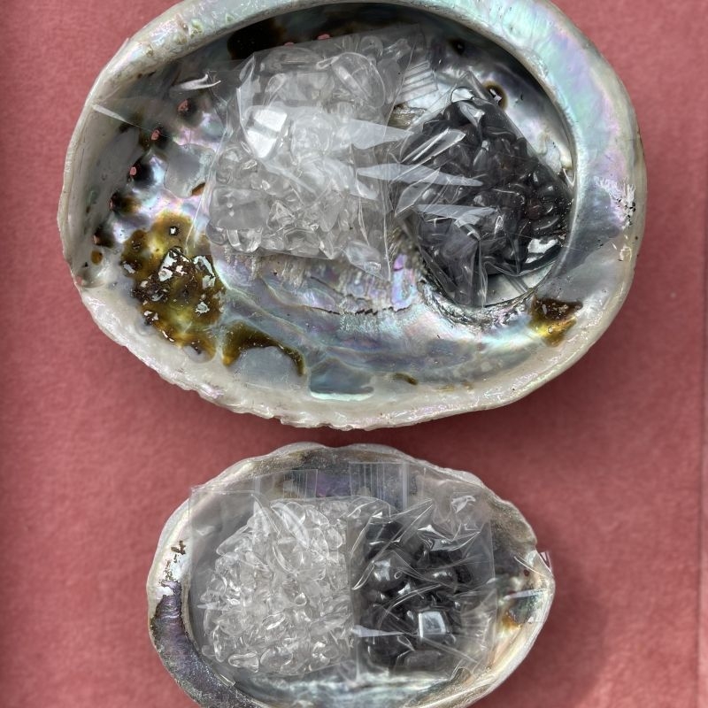 Edelstenen op- en ontlaad set van Hematiet en Bergkristal in abalone schelpt.