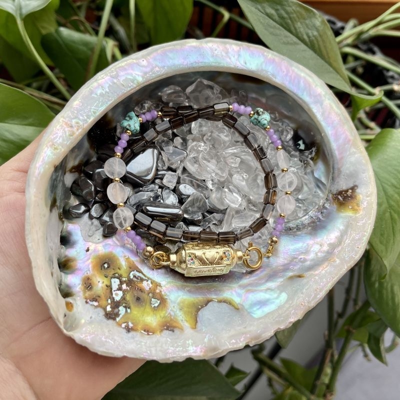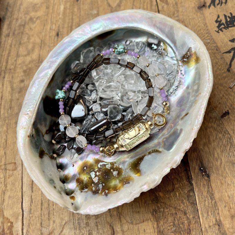Edelstenen sieraden dienen te worden gereinigd en opgeladen om de werking optimaal te behouden. Op- en ontladen van jouw edelstenen sieraad kun je door je sieraad in de volle maan te leggen (zorg er wel voor dat je sieraad op een droge plek ligt om slijtage van de RVS onderdelen te beperken. Een eenvoudigere en net zo effectieve manier van het reinigen en opladen van jouw edelstenen sieraad is het plaatsen van jouw sieraad in deze abalone schelpt gevuld met edelsteentjes van Hematiet en Bergkristal. We raden je aan dit eens per week te doen, maar je kunt de schelp ook op je nachtkastje plaatsen en jouw sieraad hier dagelijks in plaatsen.