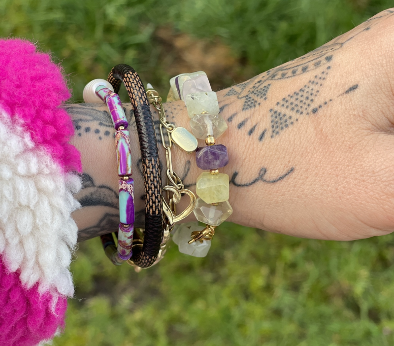 Deze mix van kwarts heeft een zeer brede werking. In deze armband zitten onder andere Amethist, Bergkristal, Rozenkwarts, Citrien, Prehniet verwerkt.