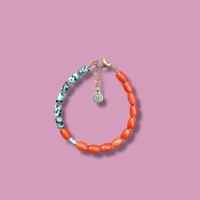 Alle sieraden worden met de hand door ons in Nederland gemaakt, en worden vervaardigd met hoogwaardige kwaliteit edelstenen en RVS onderdelen die niet verkleuren. Deze armband is gemaakt van bloedkoraal en Jaspis en bestaat uit steentjes van verschillende afmetingen. De armband kan in lengte worden versteld d.m.v. het kettinkje aan de sluiting.