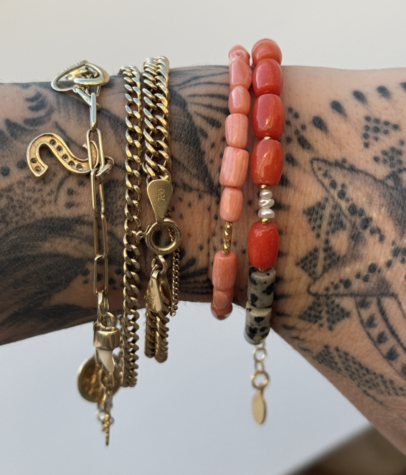 Wij adviseren om je sieraden af te doen tijdens het slapen; douchen; zonnen / zwemmen en sporten. Zout, chloor, maar ook parfum en verzorgingsproducten als haarspray en cremes kunnen de beschermlaag van het RVS of de plating van andere kralen die we gebruiken aantasten. Niet alle edelsteen-soorten kunnen daarnaast tegen water en deze kunnen doffer worden of zelfs verkleuren wanneer deze hiermee in aanraking komen. Het kan altijd voorkomen dat een RVS slotje verkleurt, dit kan te maken hebben met de zuurtegraad van de huid (deze verschilt per persoon). Bewaar je sieraden wanneer je ze niet draagt in het zakje dat je bij je bestelling geleverd krijgt.
