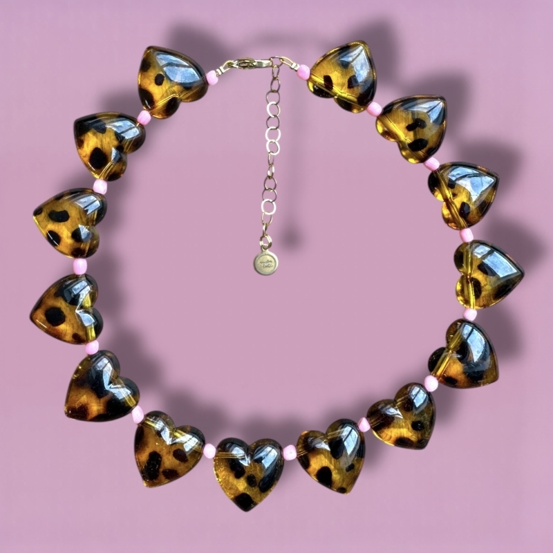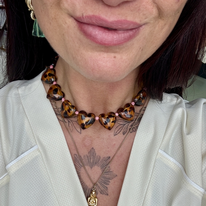 Deze heerlijke hartjesketting is gemaakt van roze koraal in combinatie met panterkleurige hartjes. Deze ketting van de Navalon X Rebecca collectie is een absolute musthave! Draag deze ketting enkel, als blikvanger - of combineer deze met meerdere kettingen en layer er op los!