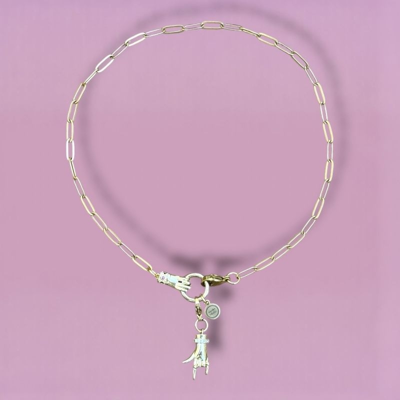 Deze prachtige gouden paperclip ketting is echt super tof om enkel te dragen. Combineert perfect met de andere items uit de Navalon X Suus collectie. Deze ketting is inclusief het bedeltje (dat ook van de ketting af kan d.m.v. het slotje dat eraan zit).