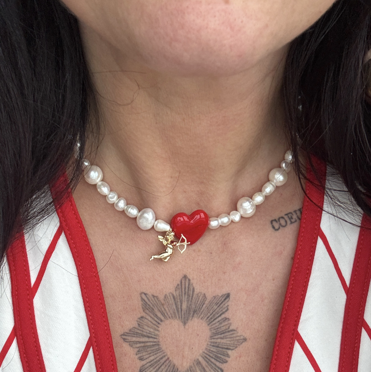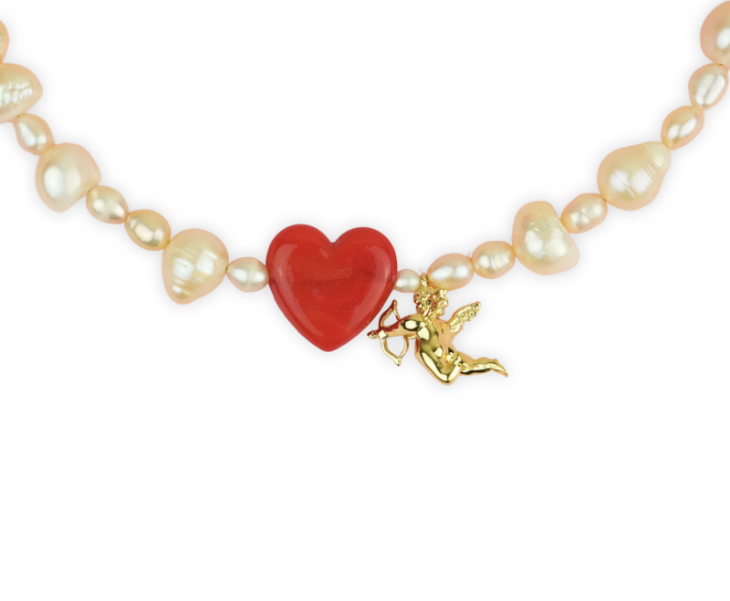 De Love shot necklace bestaat uit zoetwaterparels met als accent een gouden cupido bedel en rood hart. Deze speelse ketting is classy, funky, edgy en klassiek tegelijk. Deze ketting kun je perfect enkel dragen, maar is ook zeer geschikt om met onze andere kettingen te combineren.