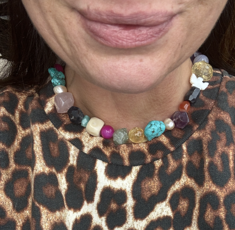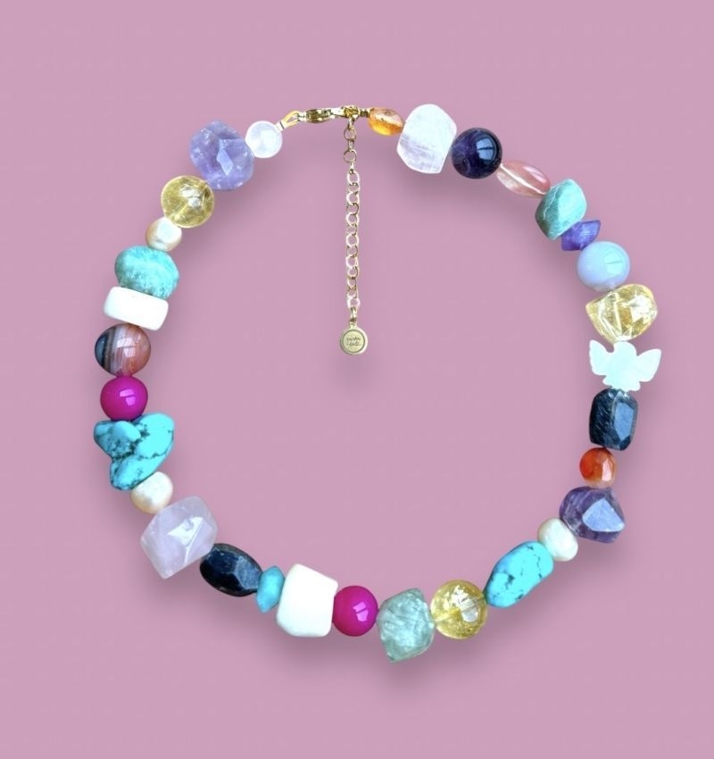 Deze prachtige statement ketting is gemaakt van een mix van edelstenen en mineralen. In deze ketting zitten de volgende materialen: bloedcarneool; rozenkwarts; cherry-kwarts; amazoniet; amethist; citrien; parelmoer; zoetwaterparel; turqueniet; prehniet; agaat en (witte) koraal.