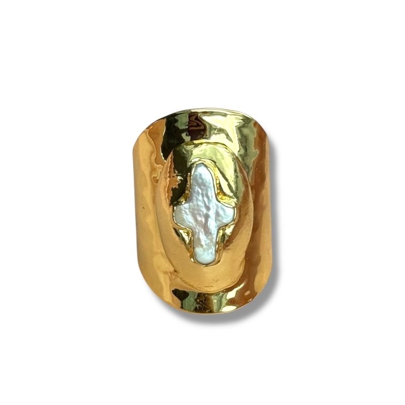 Deze prachtige ring heeft als centerpiece een mooi parelmoer kruisje. De vorm van iedere ring is anders, daarmee ben jij gegarandeerd van een uniek exemplaar. De ring is in grootte verstelbaar waardoor deze vrijwel iedereen past.