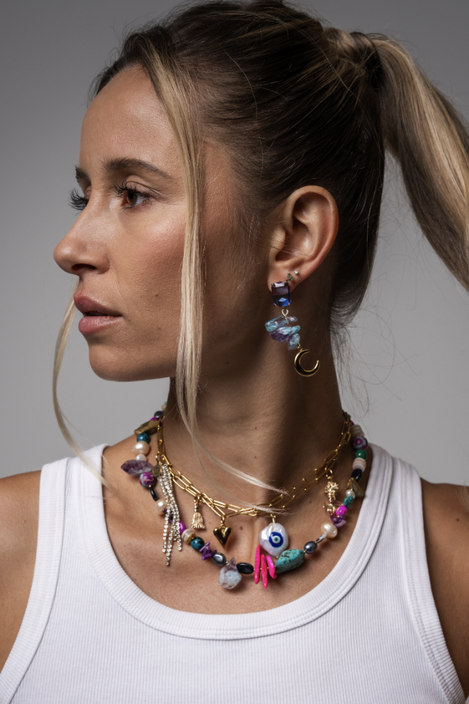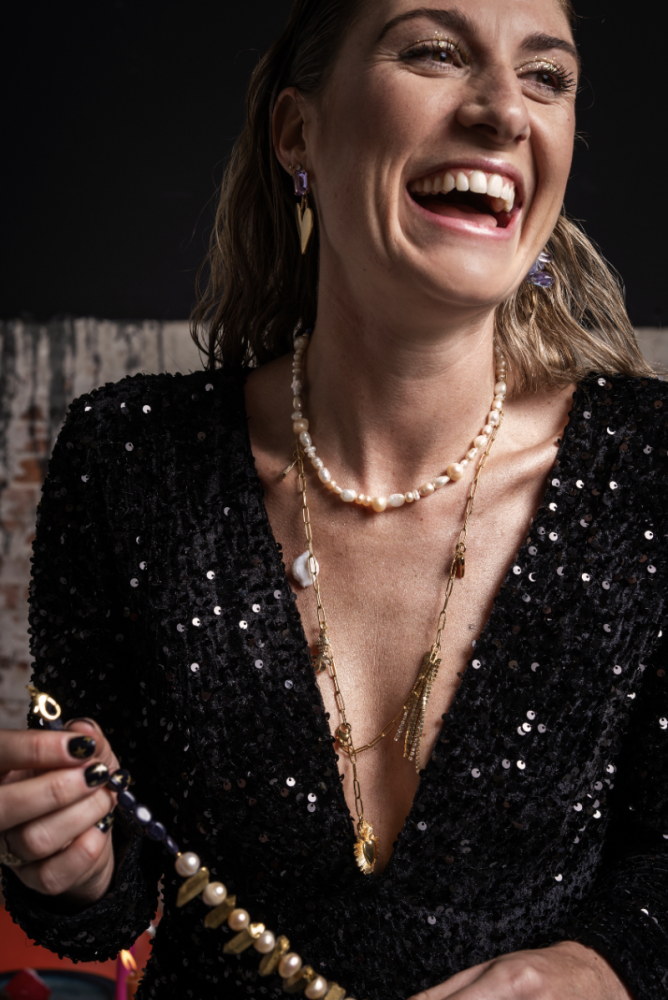 Suus (SUUS.allroundstyling): 'De collectie past erg bij mijn eigen style, waarin ik hou van een verassing. Mocht je mij dus in een basic outfit zien, dan is dat wel met veel sieraden en glimmende of gekleurde schoenen. Ik ben dan ook dol op glitter en draag altijd wel iets van felle kleuren! In deze collectie met Navalon and Dante zie je dat helemaal terug. Van basic met een twist tot aan glitters en veel kleur. De collectie is volledig ‘’mix and match’’, zodat het bij elke mood of gelegenheid te dragen valt'.