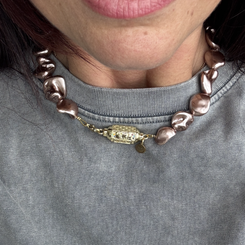 Een moderne klassieker: donkere parelachtige kralen met een diepe bruine glans, afgewerkt met gouden sluiting. Een stuk dat aardse elegantie en kracht uitstraalt.