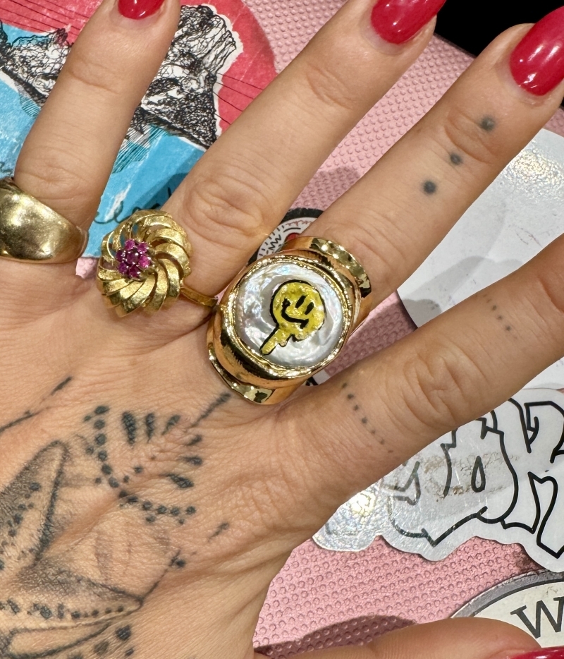 Deze ring van zoetwaterparel is handbeschilderd door kunstenares Flowerbombartist; Chrissy Peters. Iedere ring is uniek van vorm, en uniek in de beschildering.