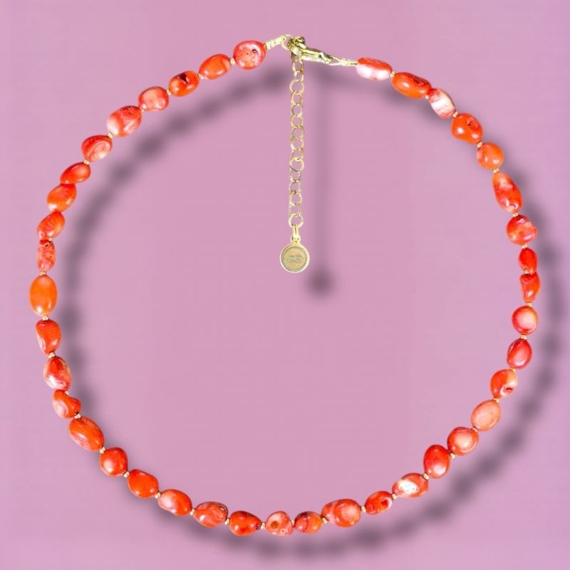 Deze ketting is gemaakt van oranje koraal.