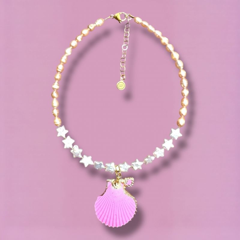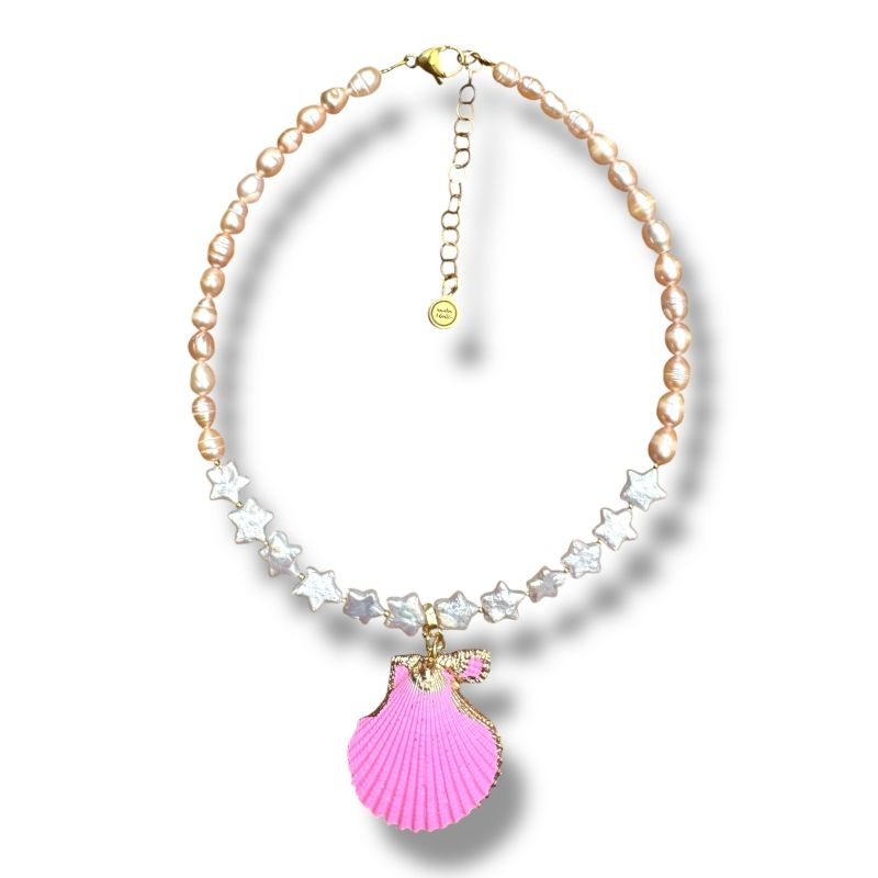Deze te gekke roze schelpenbedel is helemaal perfect voor aan jouw Navalon kettingen! Combineer 'm zoals Rebecca aan de Stardust necklace of hang 'm aan je bestaande oorbel als bedel.