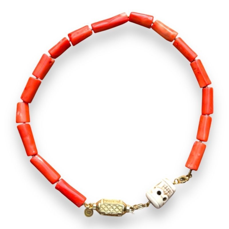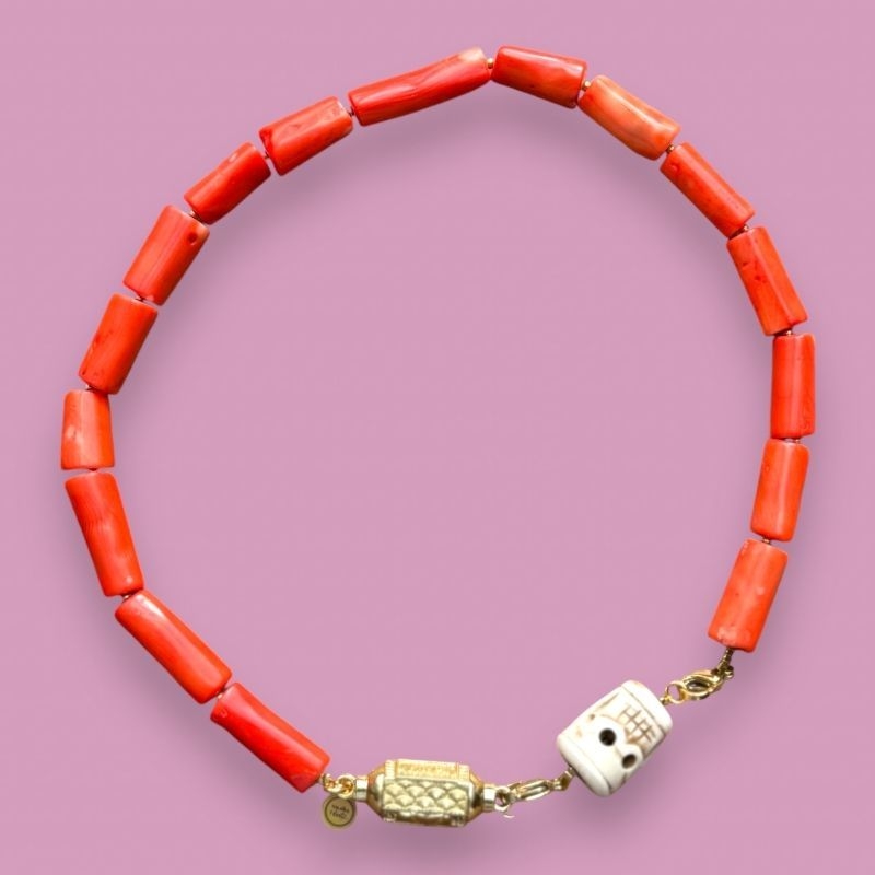 Alle sieraden worden met de hand door ons in Nederland gemaakt, en worden vervaardigd met hoogwaardige kwaliteit edelstenen en RVS onderdelen die niet verkleuren. Deze ketting is gemaakt van bloedkoraal en roze schelp.