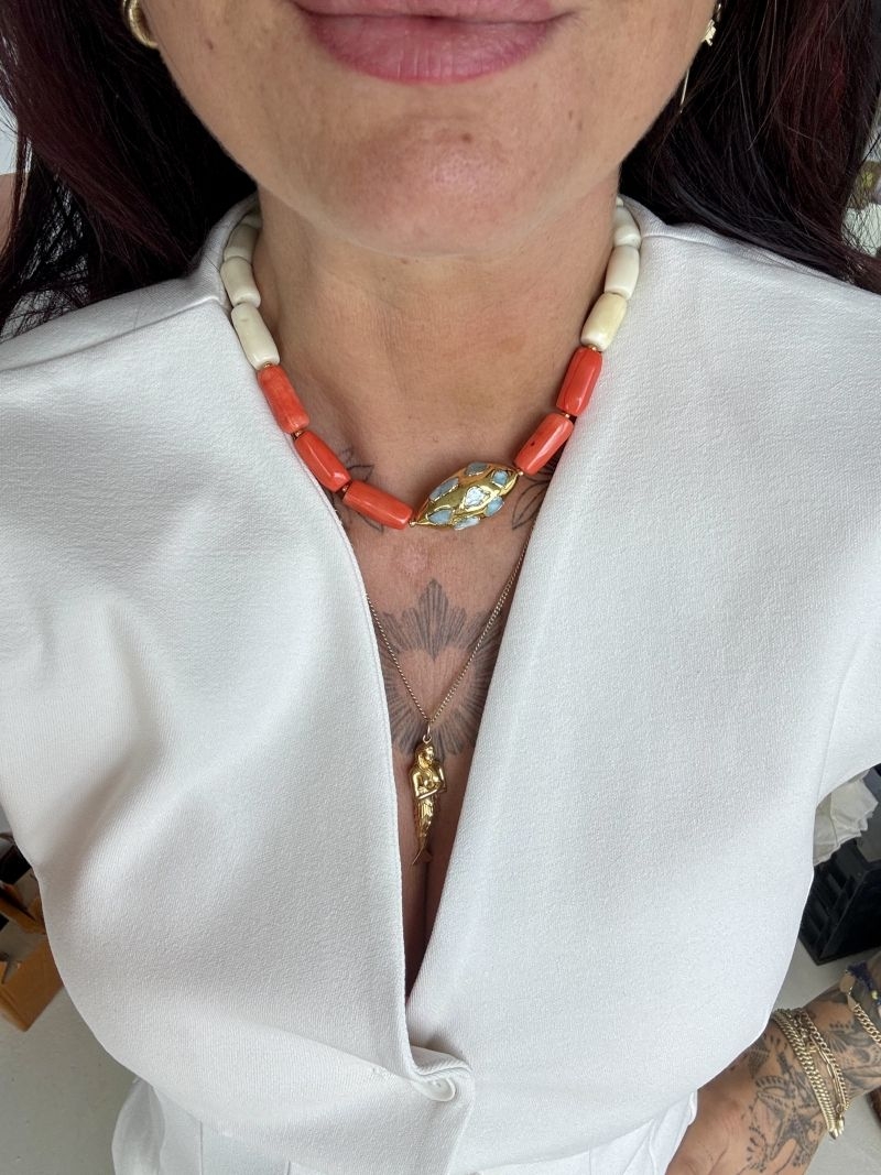 Een levendige combinatie van zachte witte tinten en vurige rode kralen, samengebracht rond een opvallend gouden element met turquoise details. Dit stuk is een ode aan contrast en glamour, perfect voor wie durft op te vallen.