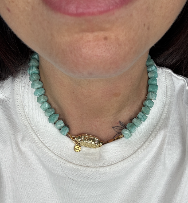 Wishbox necklace Ayu is gemaakt van Amazoniet en heeft een gouden afwerking met natuurlijk onze signature wishbox bedel. Met deze statement ketting steel je gegarandeerd de show.