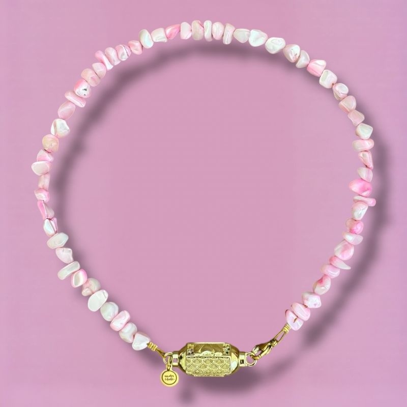 Alle sieraden worden met de hand door ons in Nederland gemaakt, en worden vervaardigd met hoogwaardige kwaliteit edelstenen en RVS onderdelen die niet verkleuren. Deze ketting is gemaakt van bloedkoraal en roze schelp.